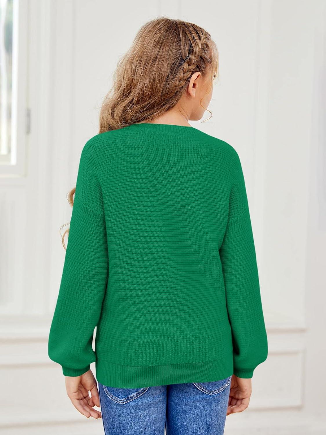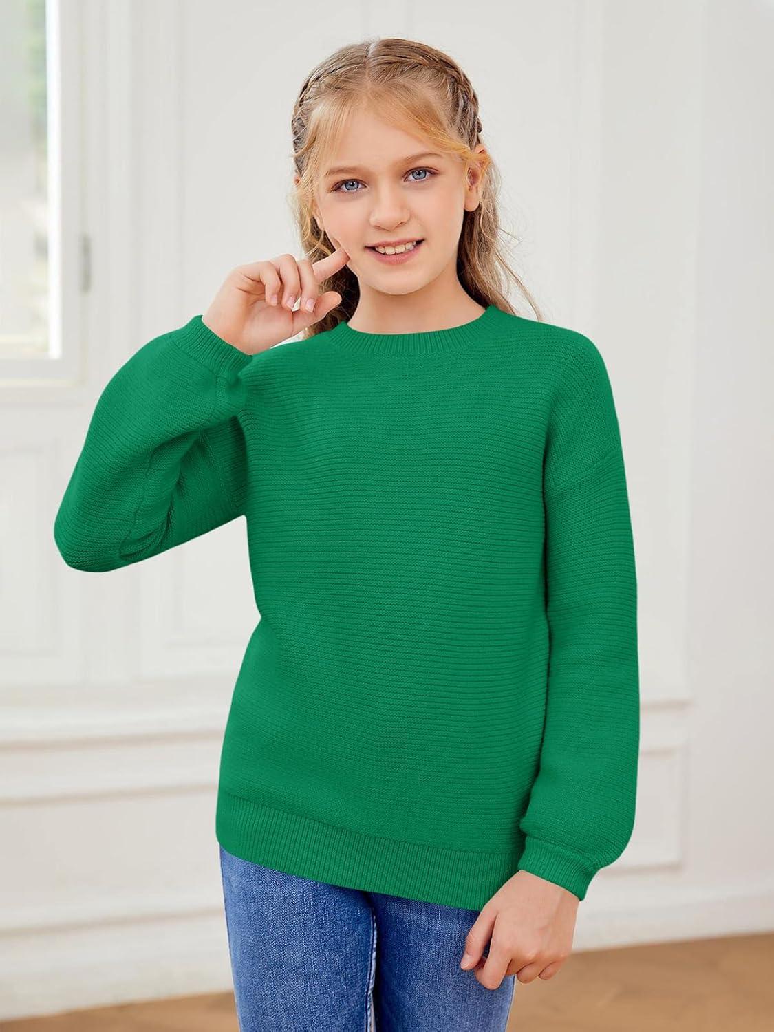 Girls Pullover Sweaters Kids Long Sleeve Drop Shoulder Sweaters Casual Boat Neck Knit Jumper Tops(Dark Green)