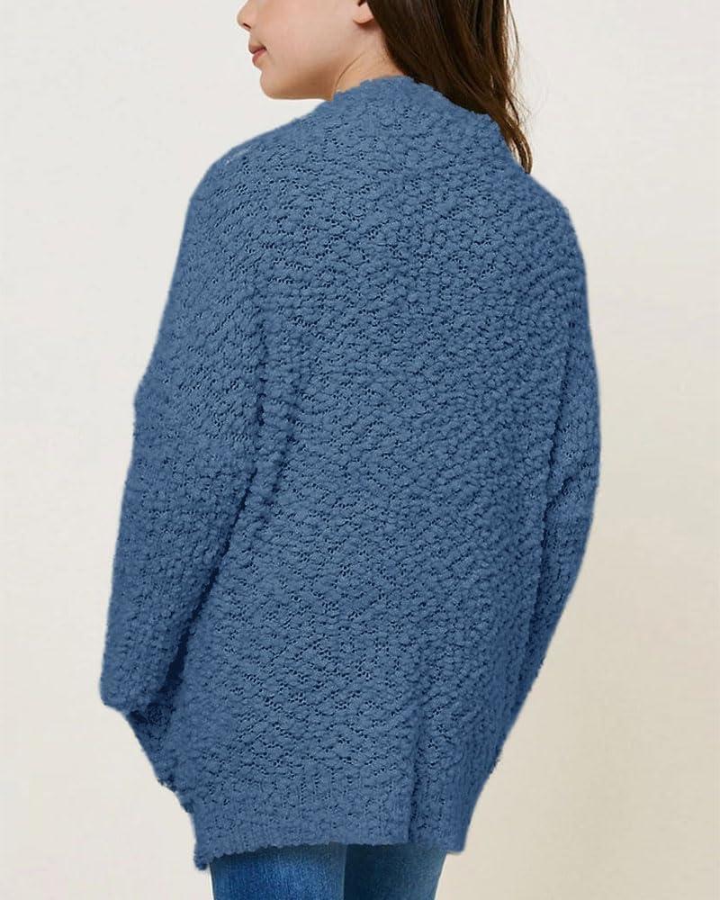Imily Bela Girls Cardigan Open Front Popcorn Knit Long Sleeve Sweaters Coat with Pockets(Blue)