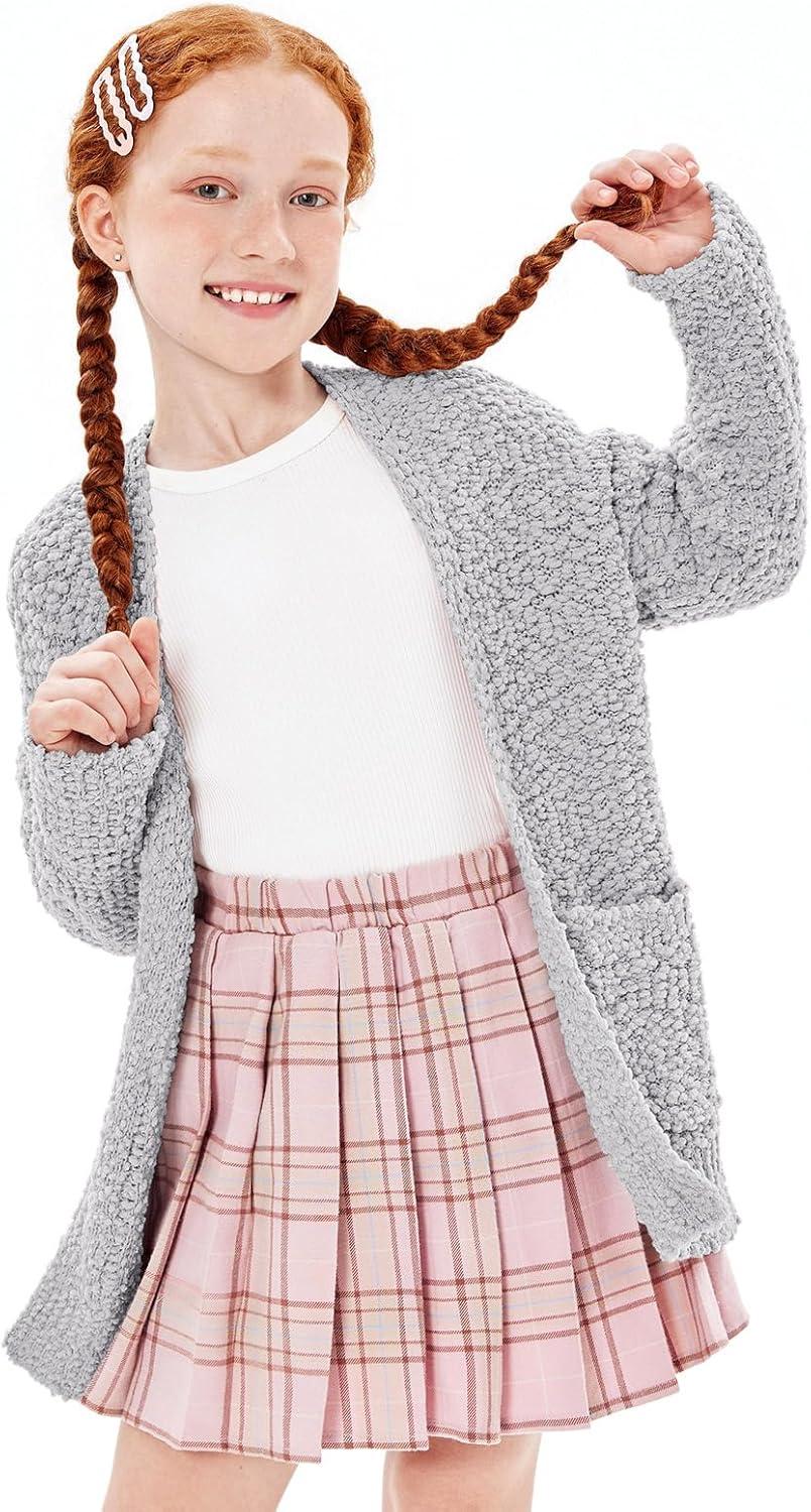 Imily Bela Girls Cardigan Open Front Popcorn Knit Long Sleeve Sweaters Coat with Pockets(Grey)