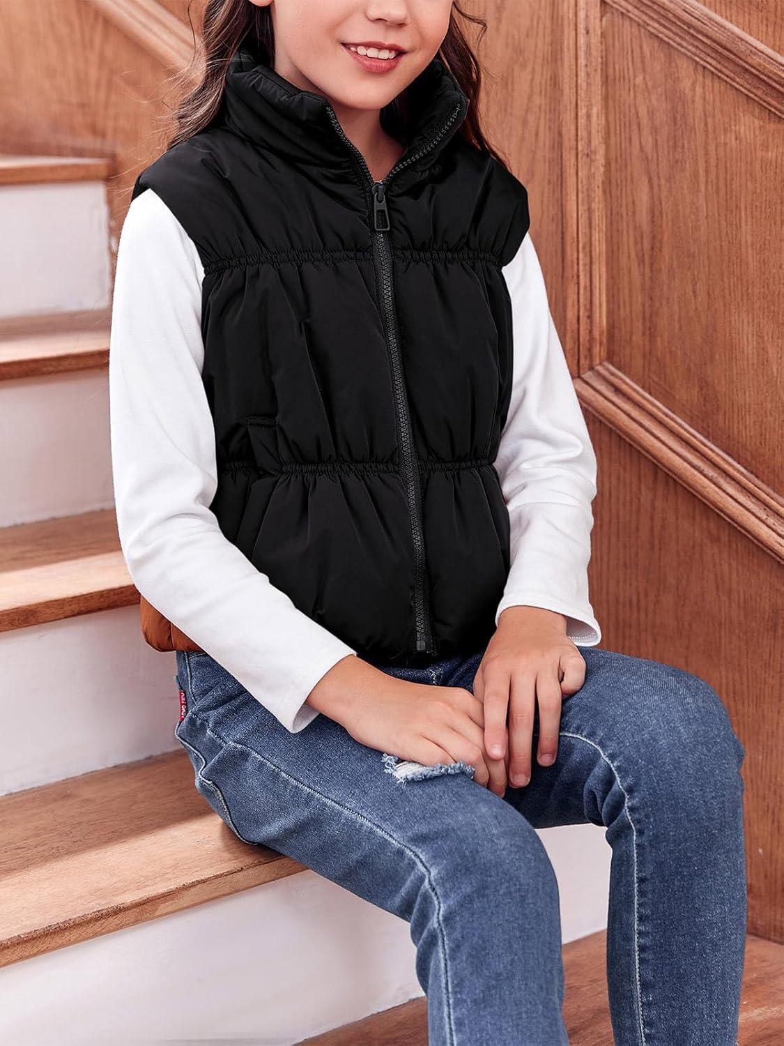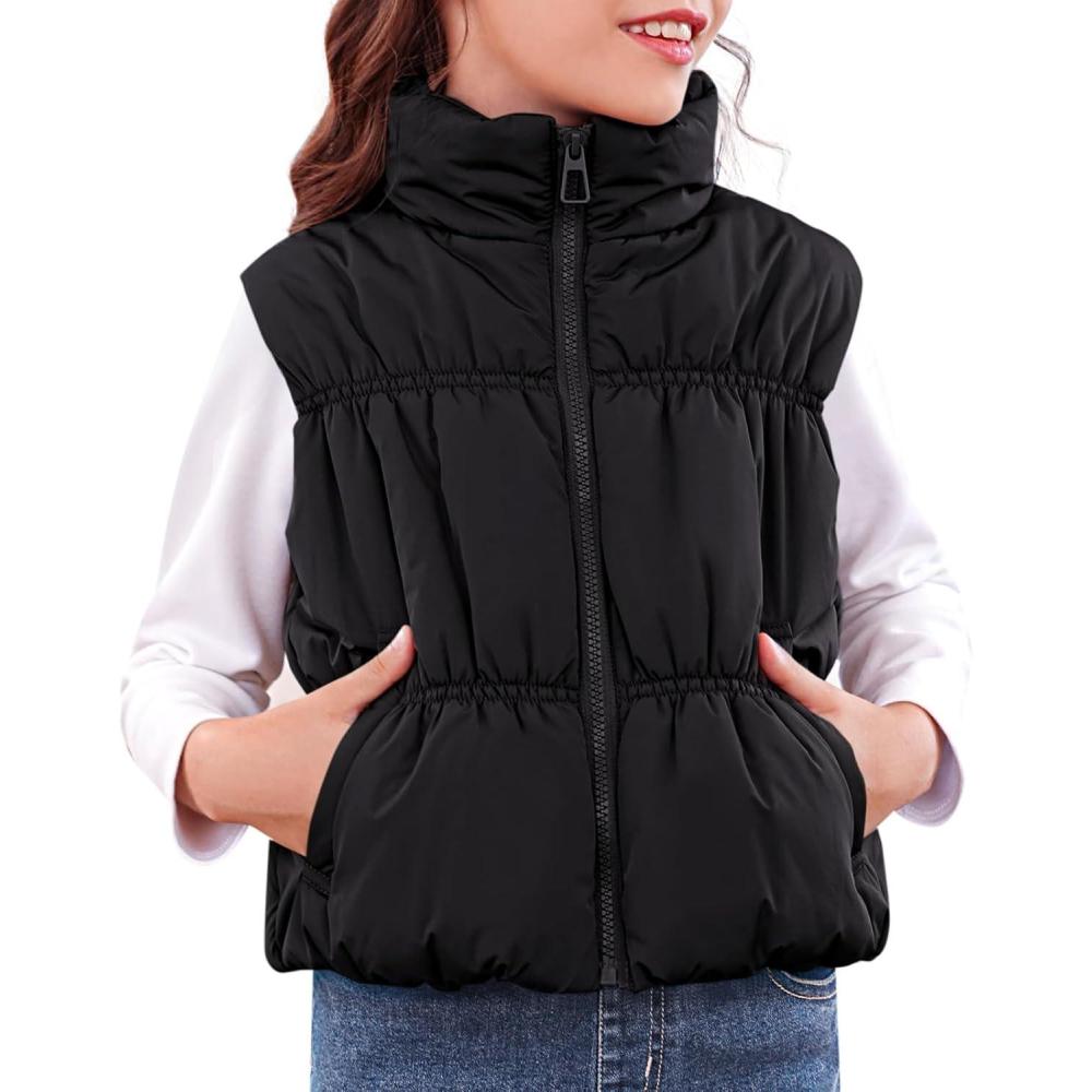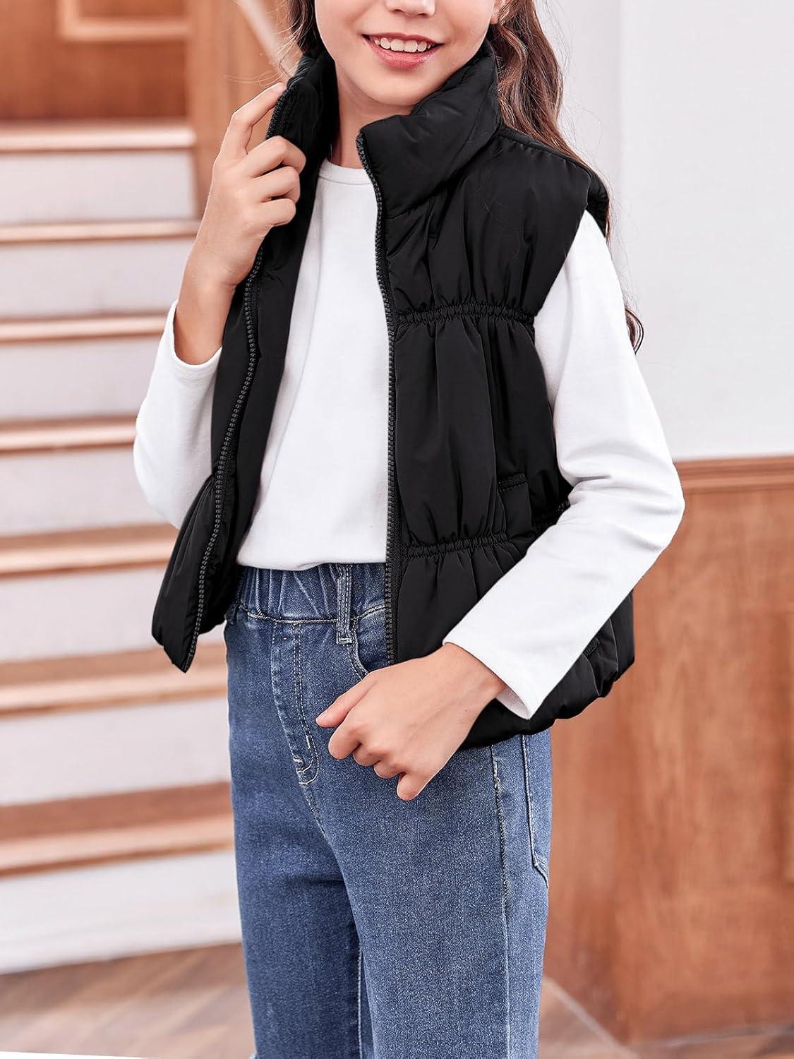 Imily Bela Girls Puffer Vest Stand Collar Sleeveless Warm Jacket Cute Outerwear With Pockets 7-14 Years(Black)