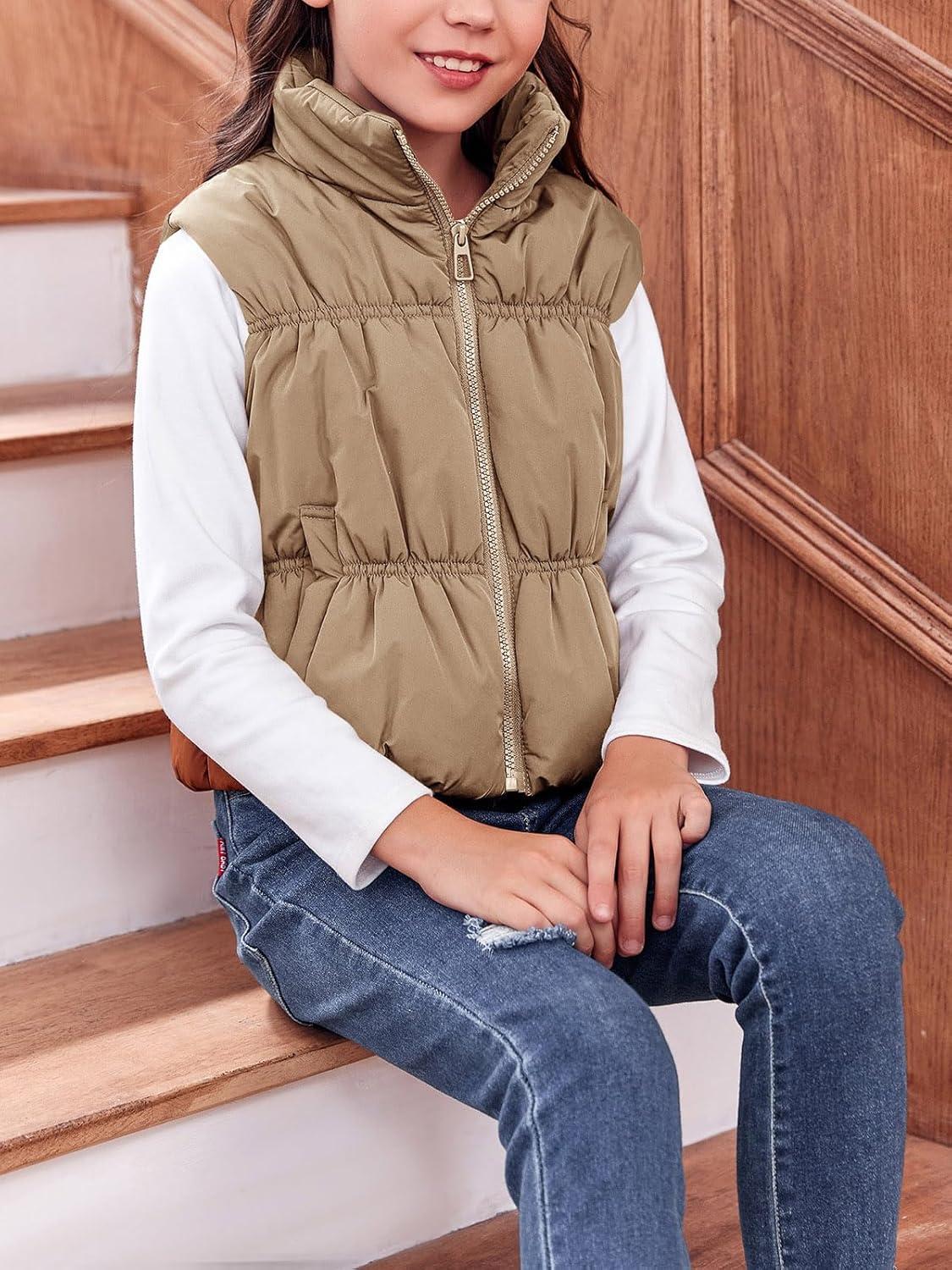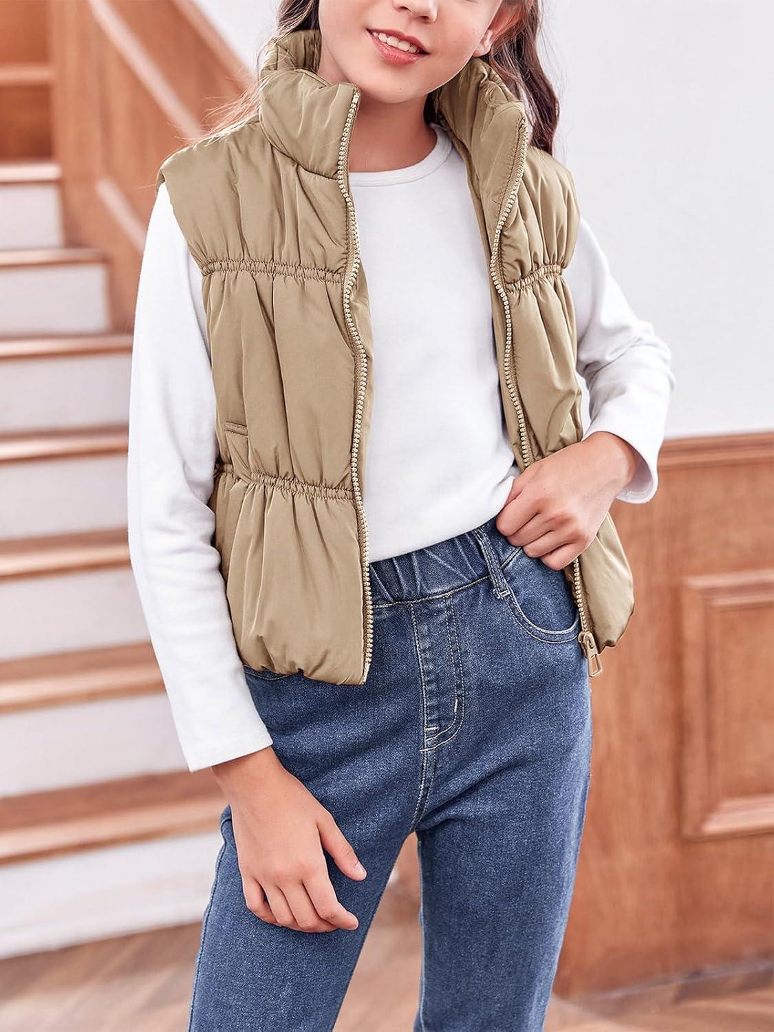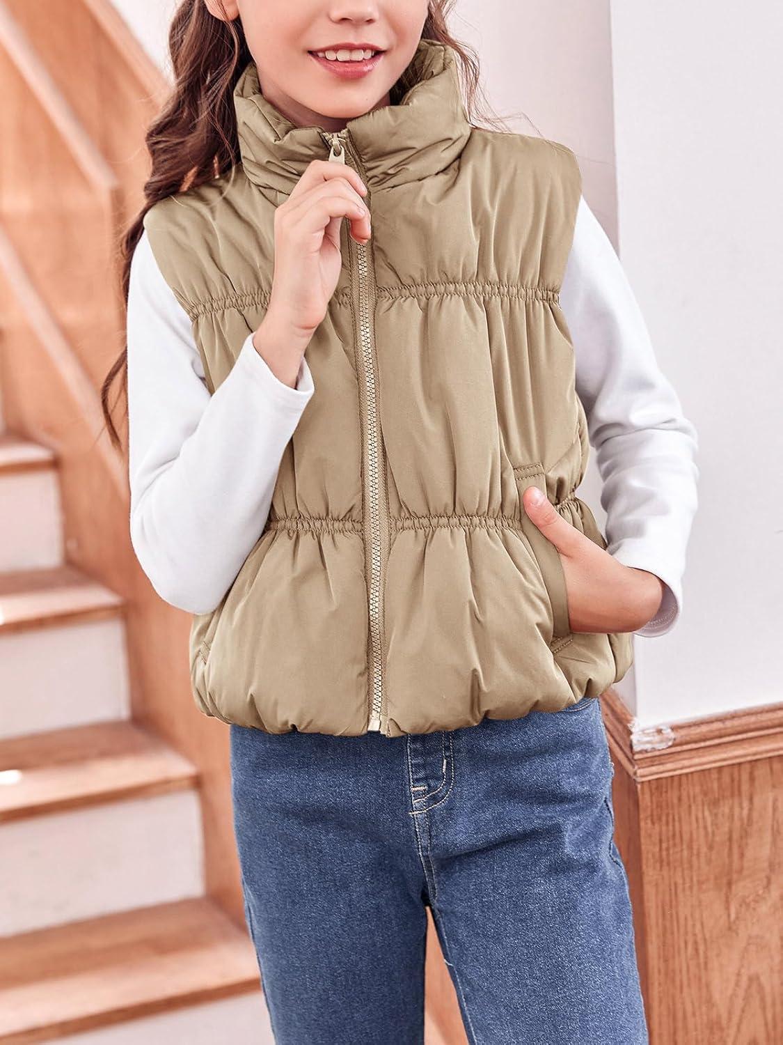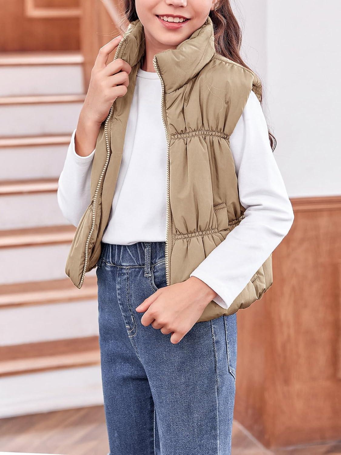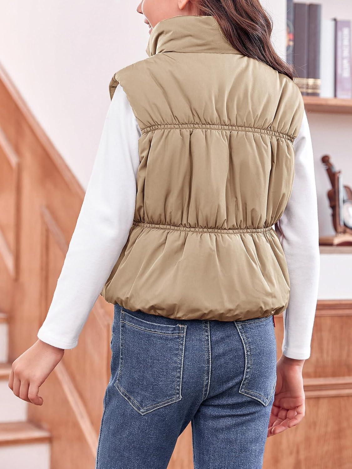 Imily Bela Girls Puffer Vest Stand Collar Sleeveless Warm Jacket Cute Outerwear With Pockets 7-14 Years(Khaki)