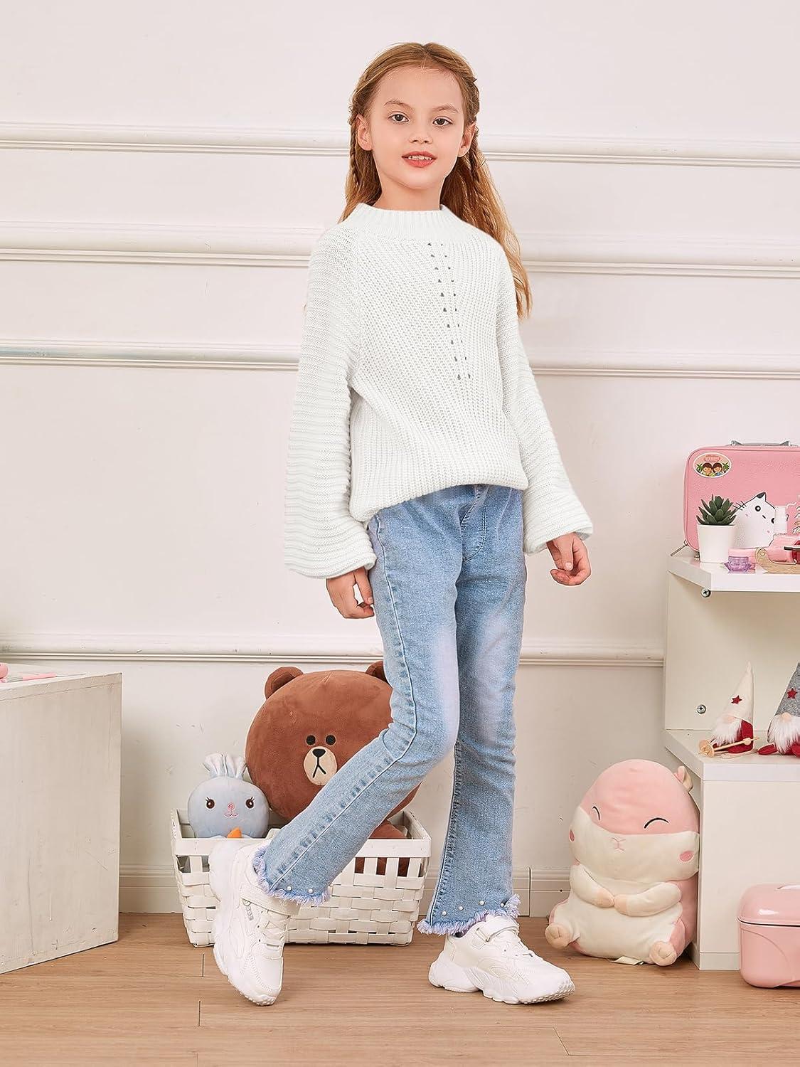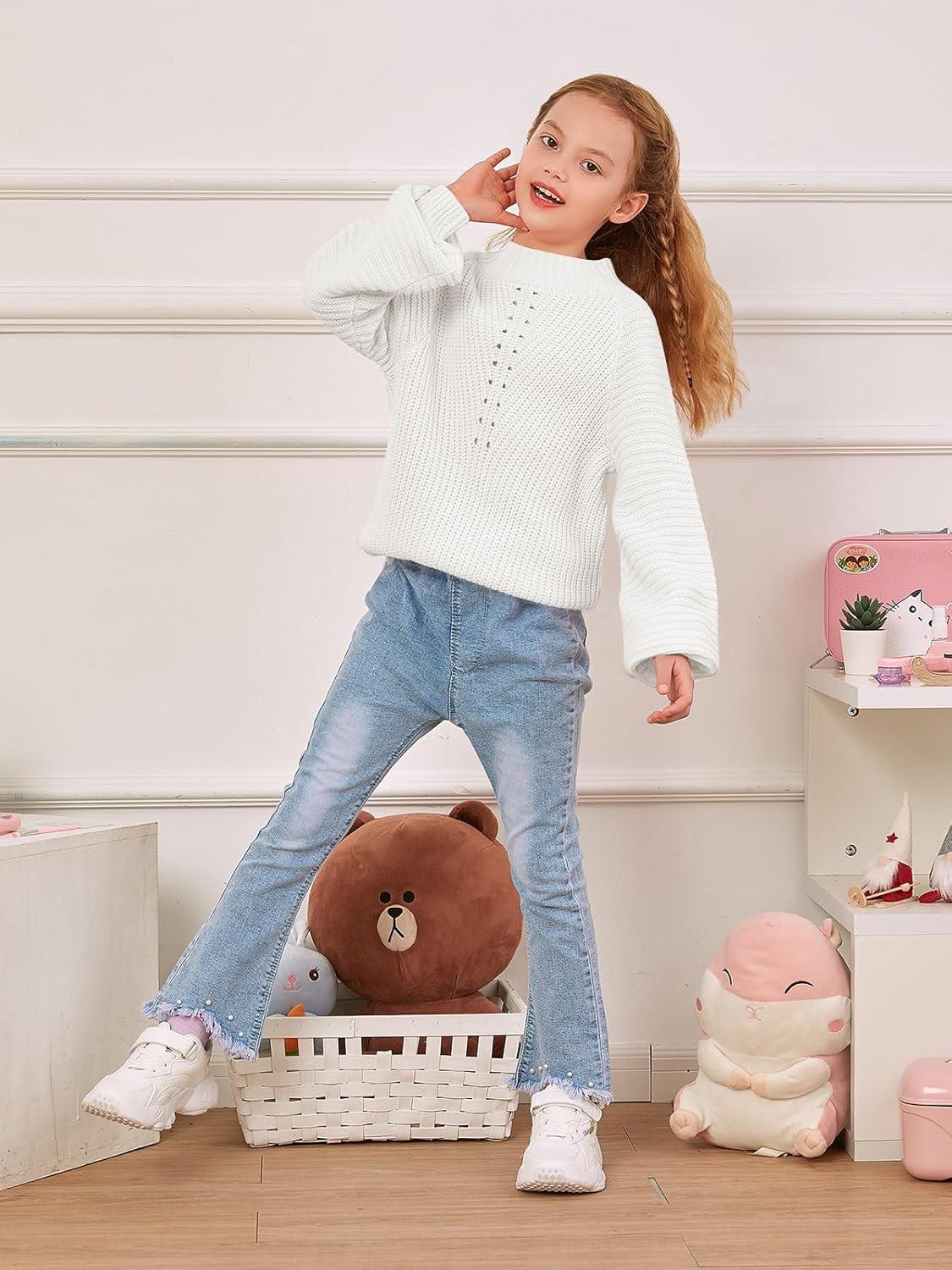 Imily Bela Girls Sweaters Kids Casual Bell Sleeve Knit Pullover Jumper Tops(White)
