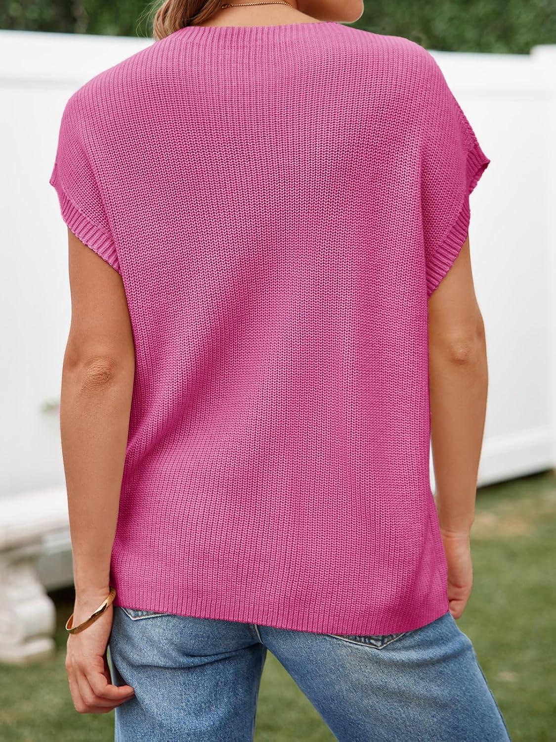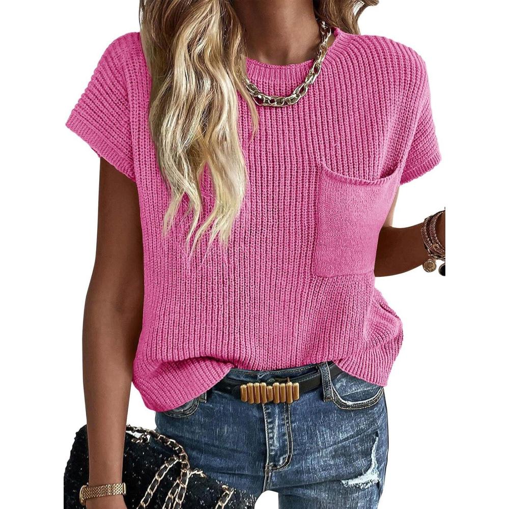 Imily Bela Summer Fall Short Sleeve Sweater for Women 2026 Crew Neck Ribbed Knit Vests Trendy Pullover Tops(Pink)