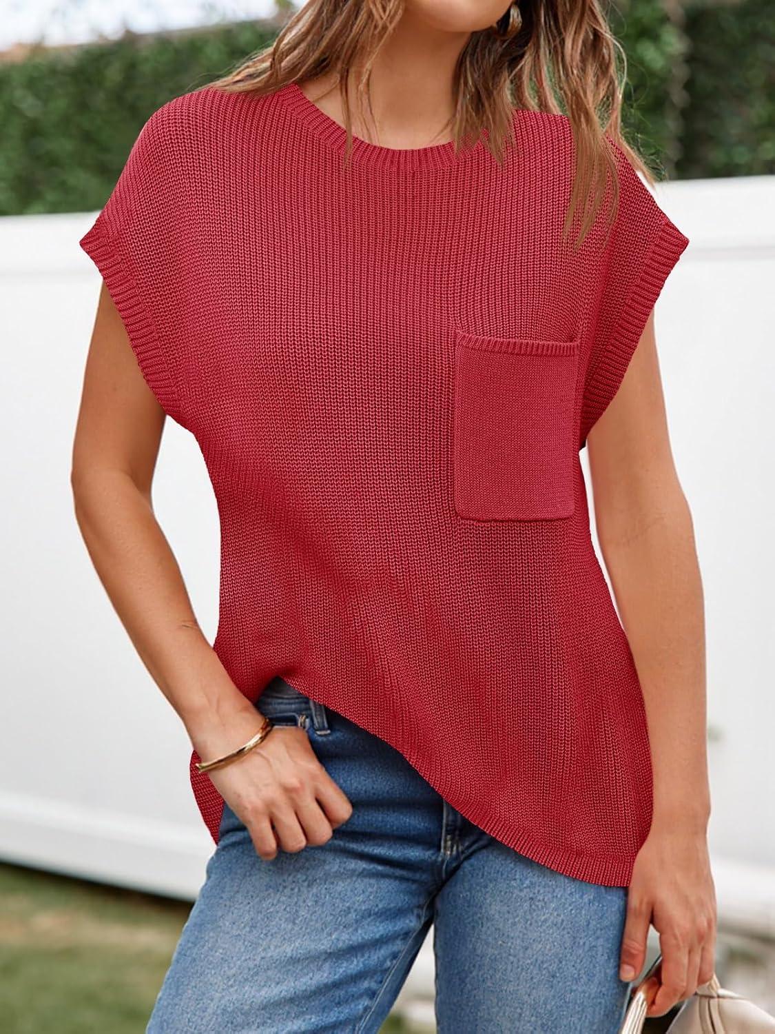 Imily Bela Summer Fall Short Sleeve Sweater for Women 2026 Crew Neck Ribbed Knit Vests Trendy Pullover Tops(Red)