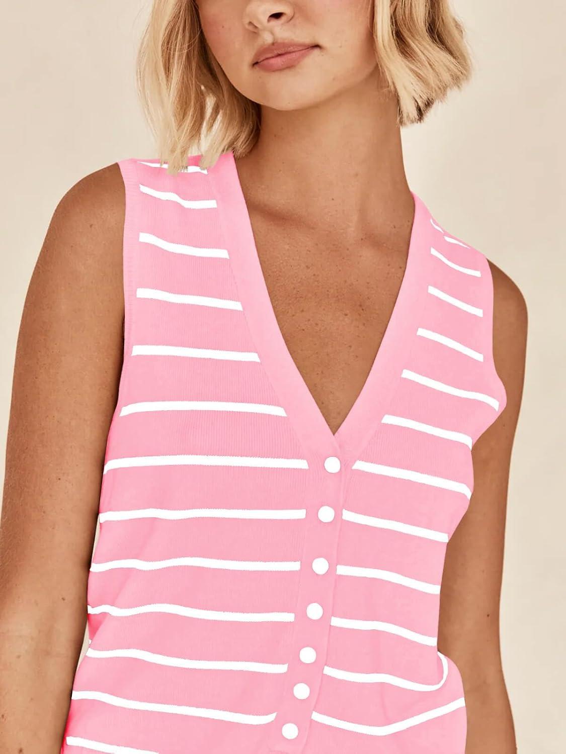 Imily Bela Womens 2 Piece Outfits Summer Striped Casual Lounge Sets Knit Sleeveless V Neck Tops Short Sets(Pink)