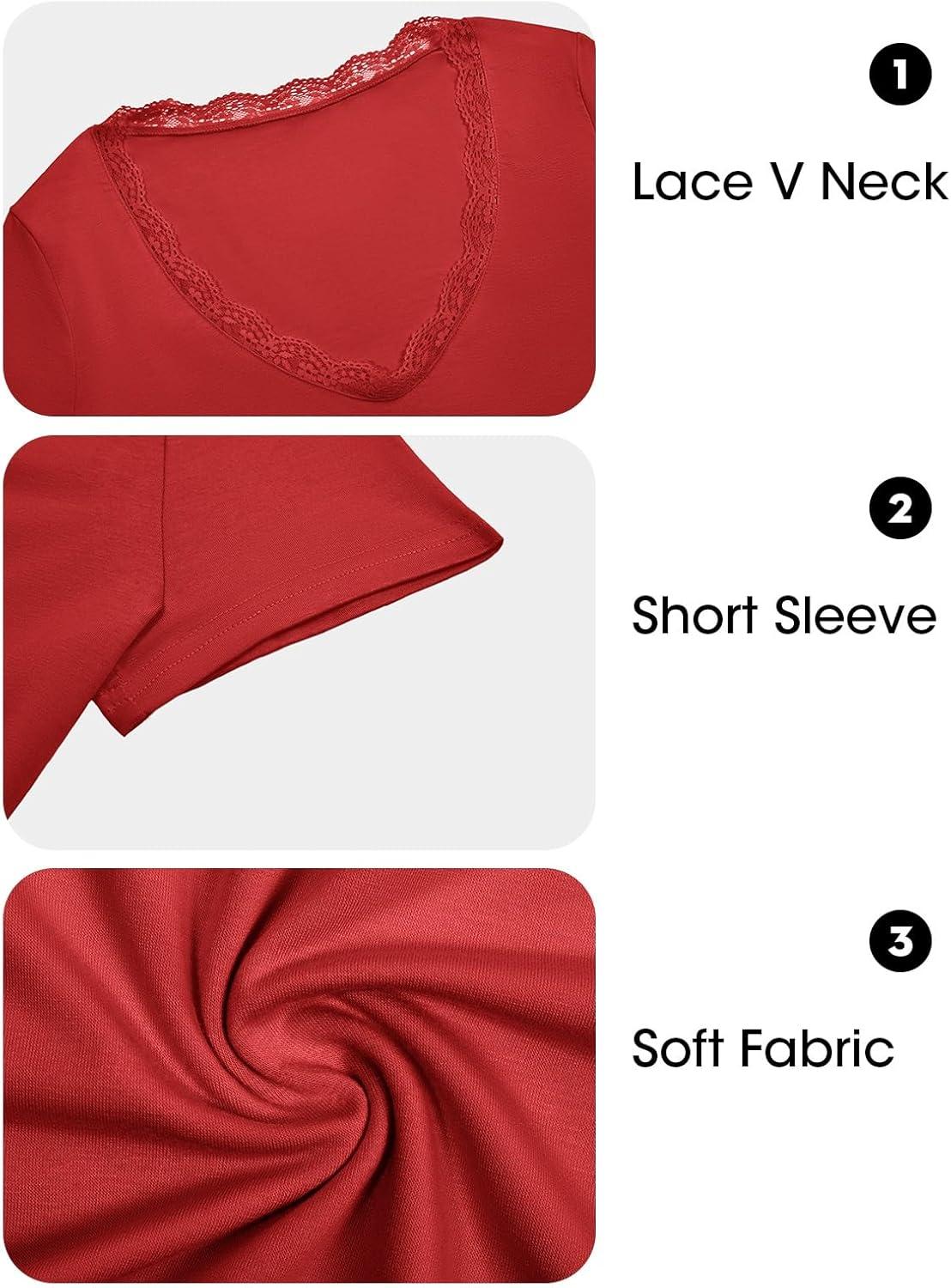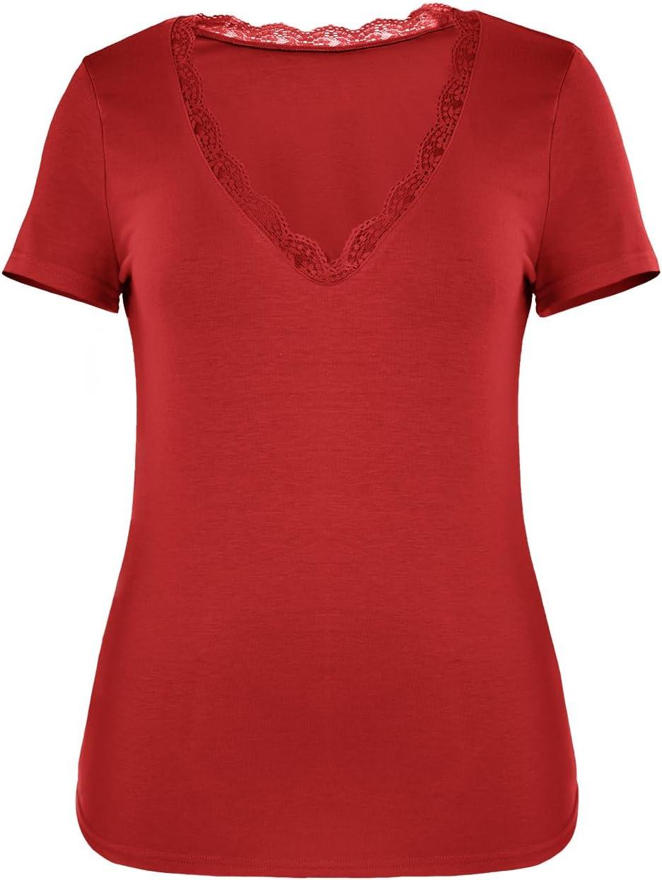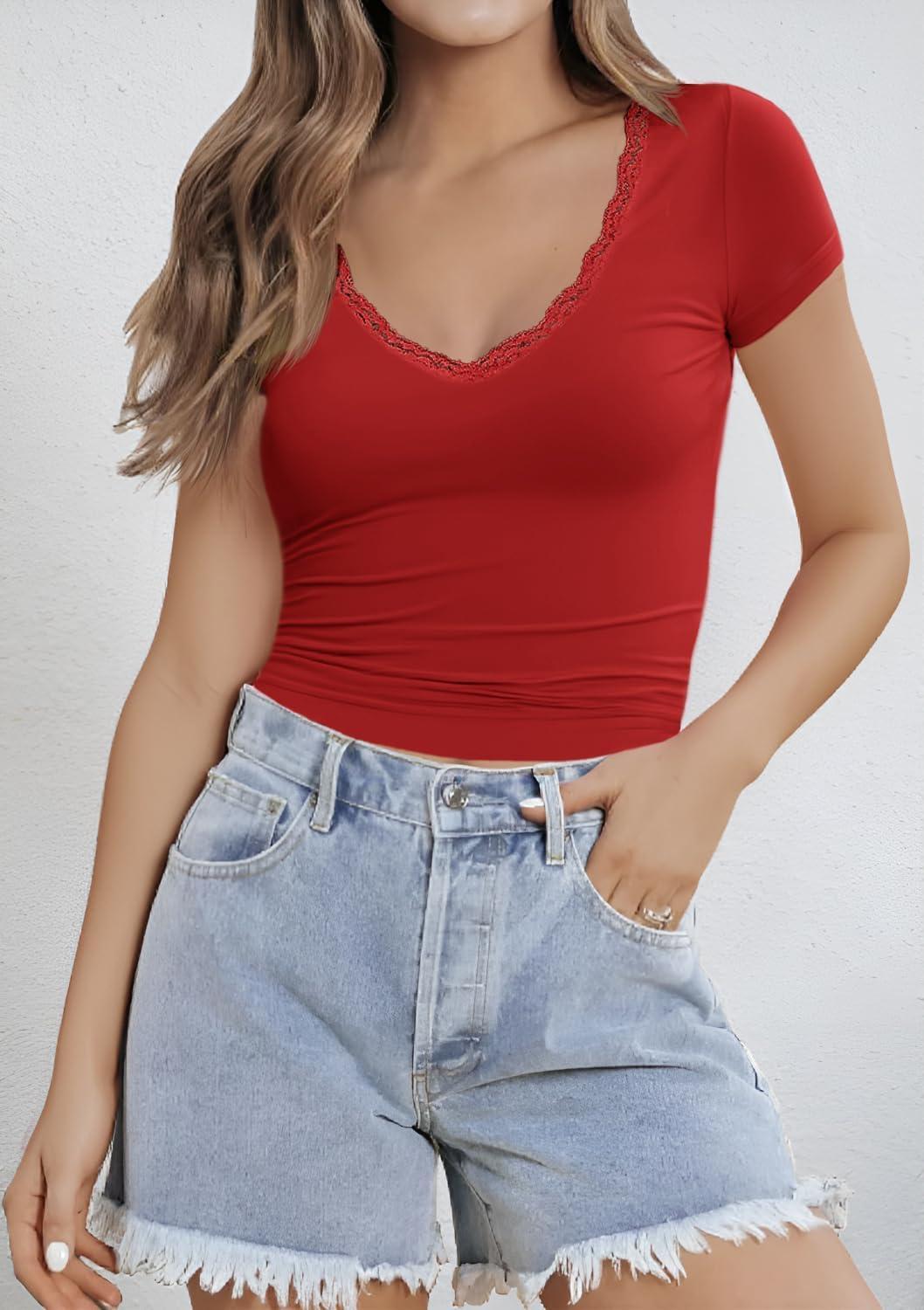 Imily Bela Womens Sexy V Neck T Shirts Summer Lace Short Sleeve Slim Fit Y2k Going Out Crop Tops(Red)