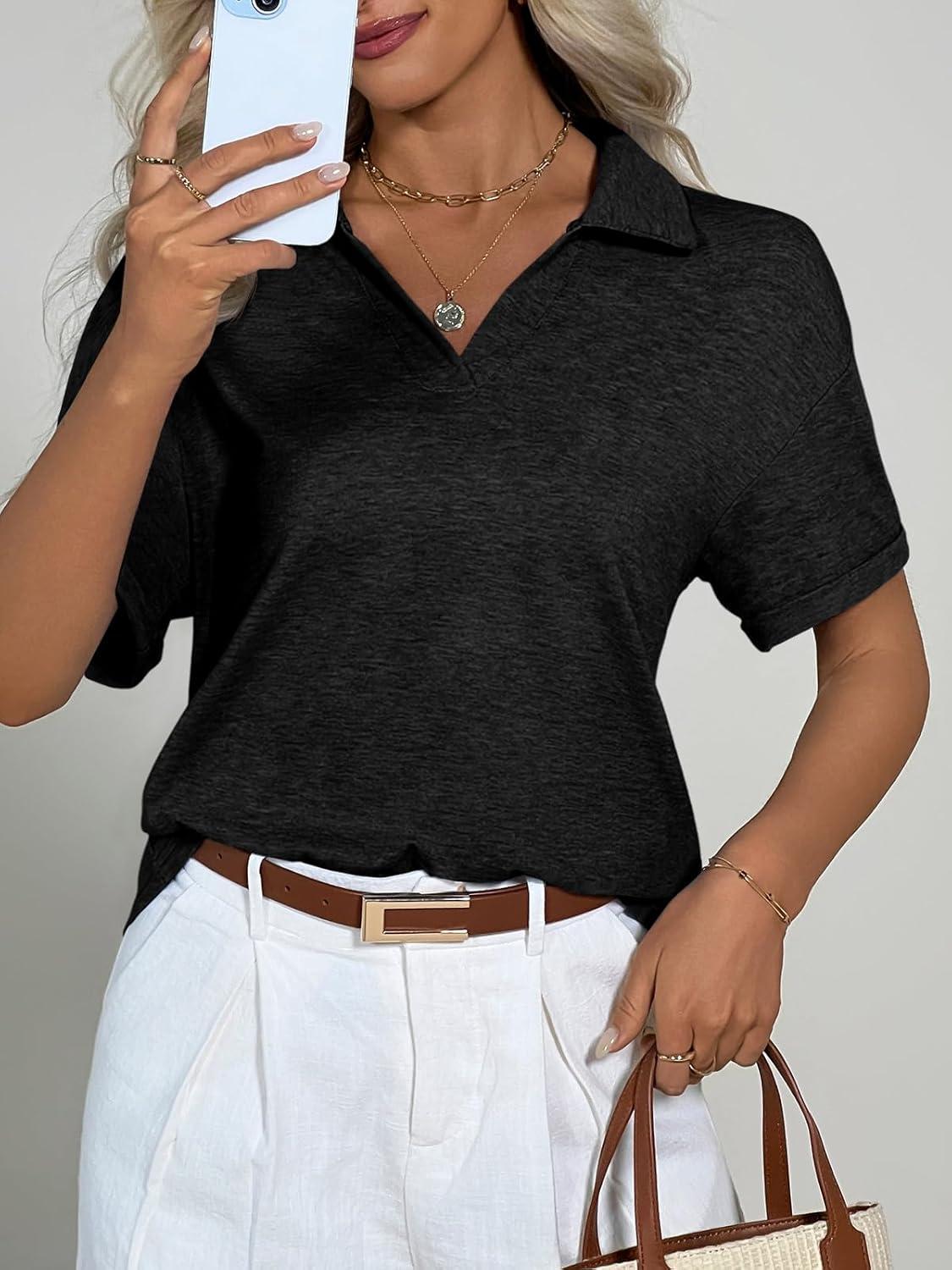 Imily Bela Womens Short Sleeve Polo T Shirts Summer Business Dressy Casual Tops Work Collared V Neck Basic Tees(Black)