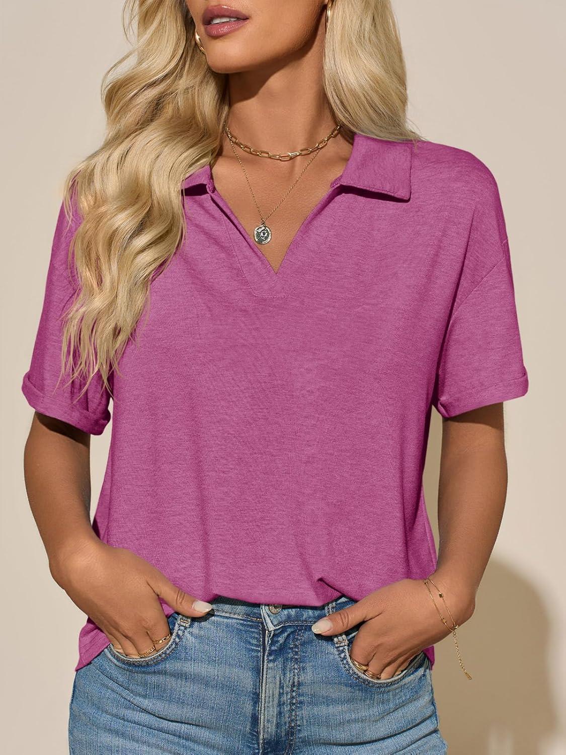 Imily Bela Womens Short Sleeve Polo T Shirts Summer Business Dressy Casual Tops Work Collared V Neck Basic Tees(Rose Red)