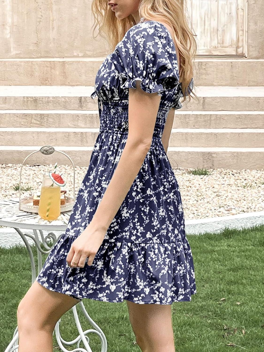 Imily Bela Womens Summer Dress Ruffle Sleeve Sqaure Neck Smocked Sun Dress Casual Boho Beach Floral Mini Dress(Dark Blue)