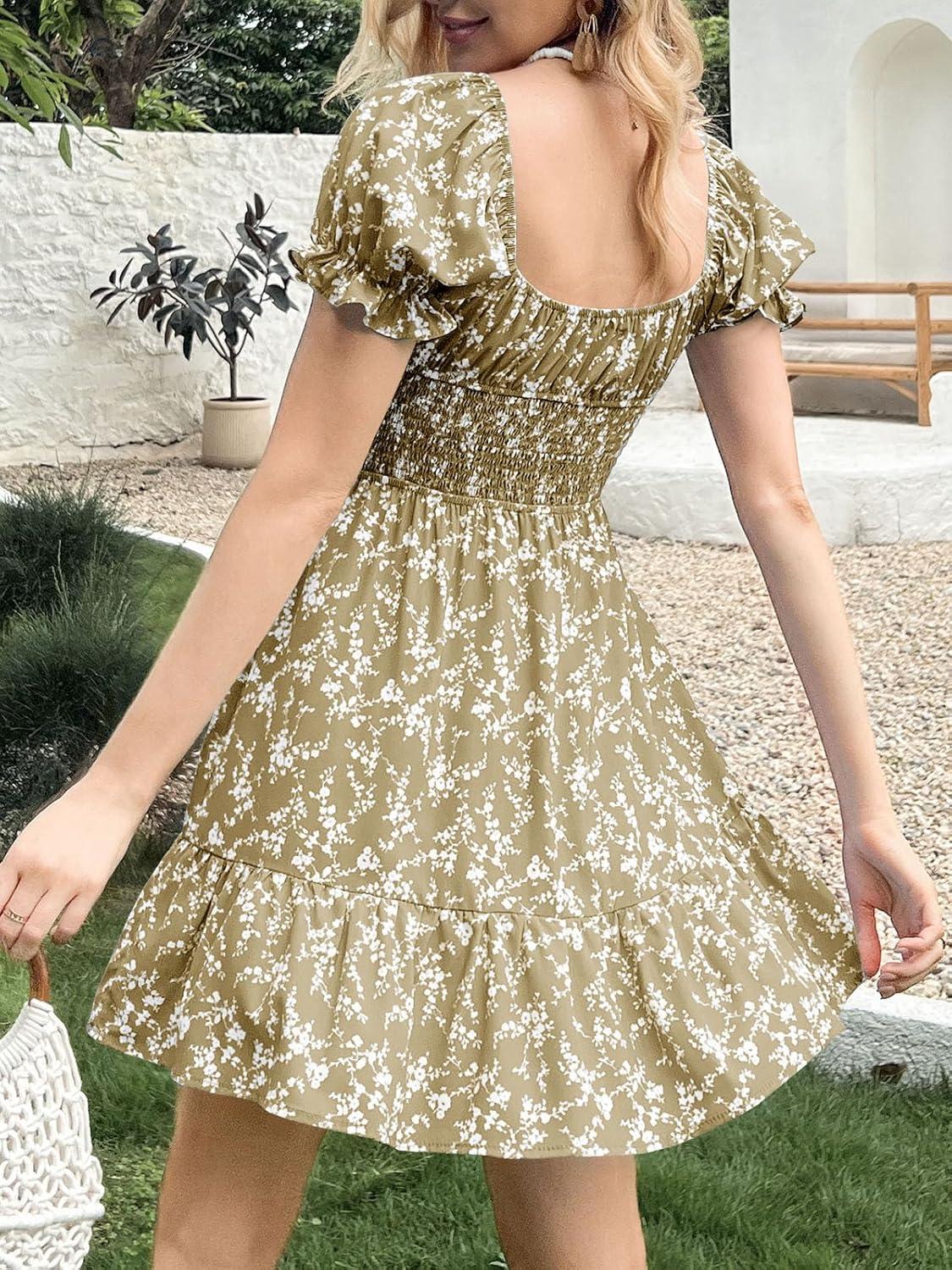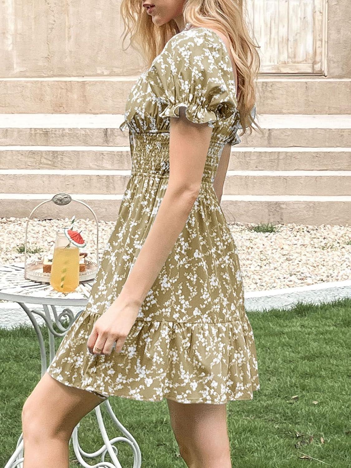 Imily Bela Womens Summer Dress Ruffle Sleeve Sqaure Neck Smocked Sun Dress Casual Boho Beach Floral Mini Dress(Light Green)