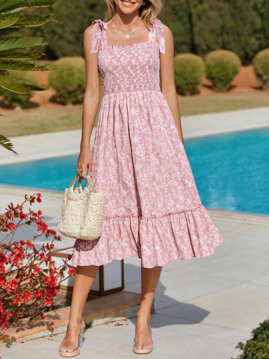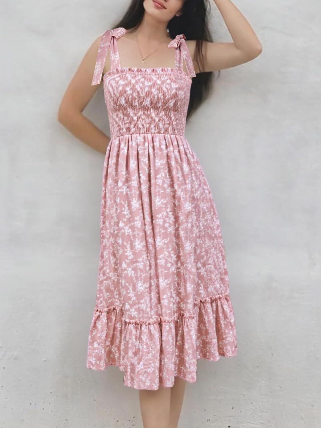 image:imageImily Bela Womens Summer Floral Boho Dress Tie Strap Square Neck Smocked Ruffle A Line Beach Long Maxi DressesLpink