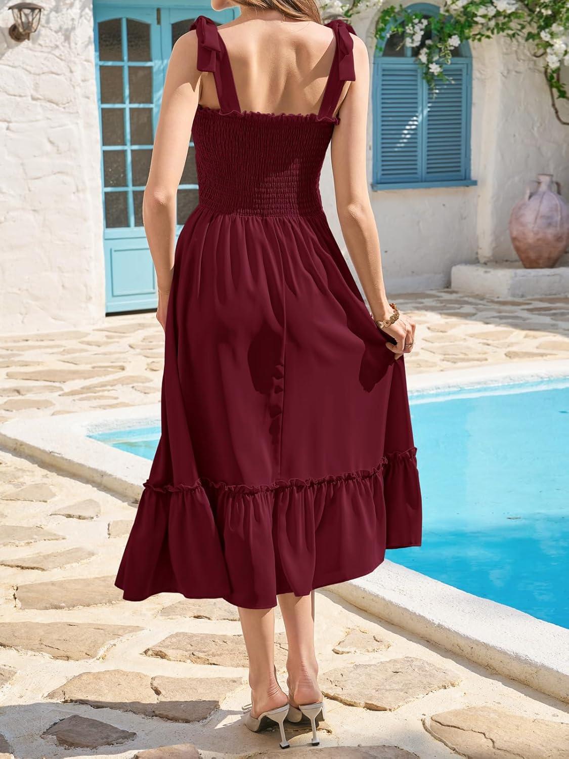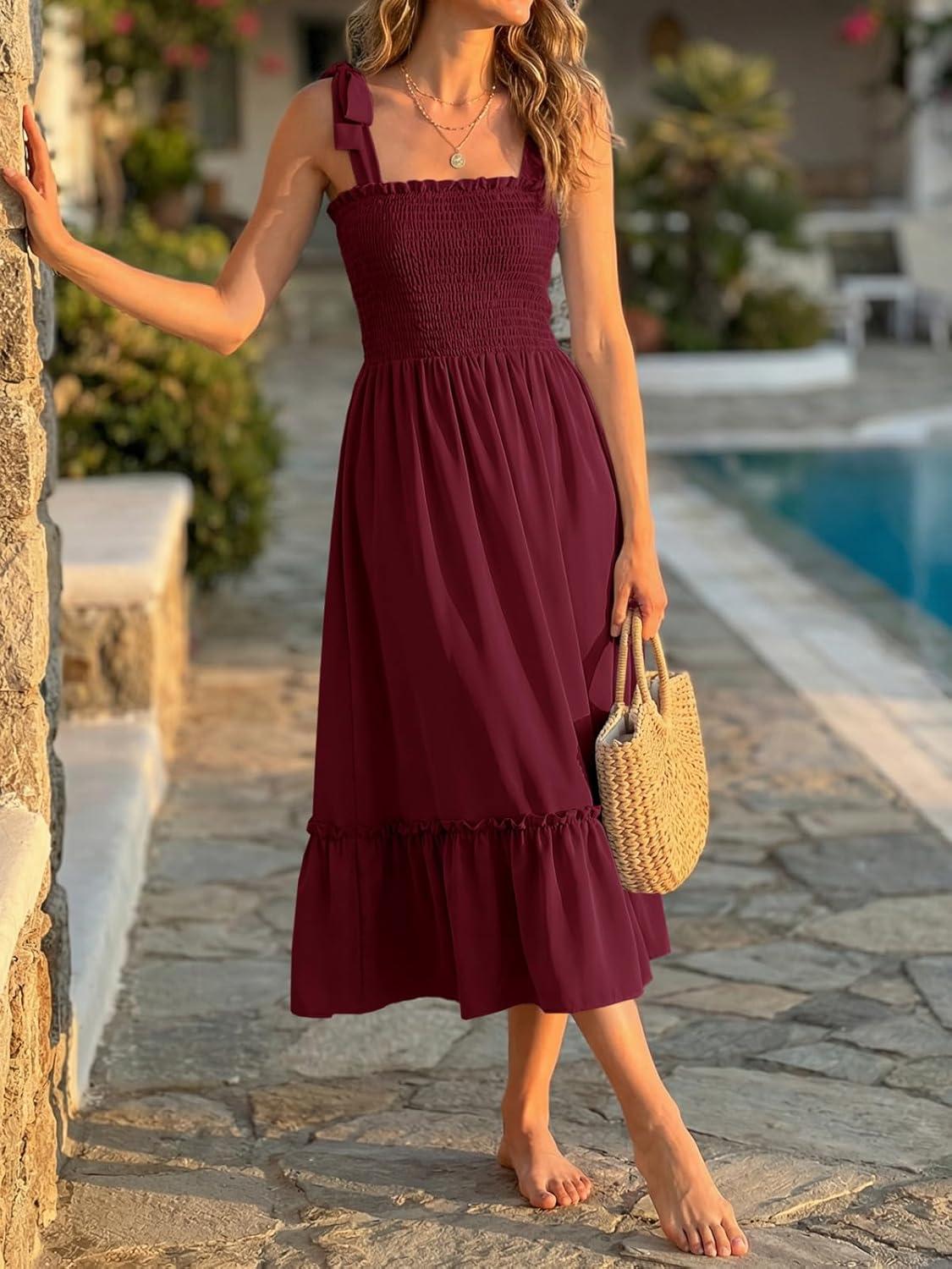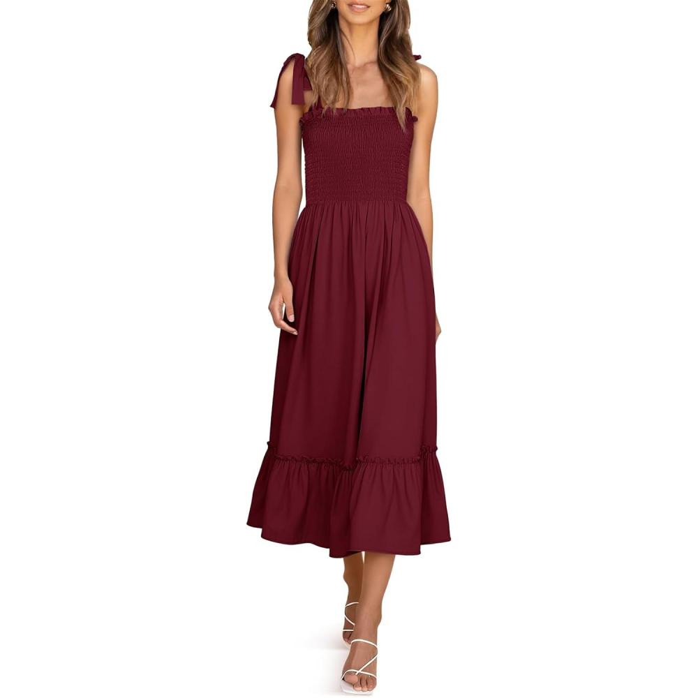 Imily Bela Womens Summer Floral Maxi Dress Boho Tie Strap Sleeveless Smocked A Line Beach Sundress Long Dresses(Z1-burgundy)