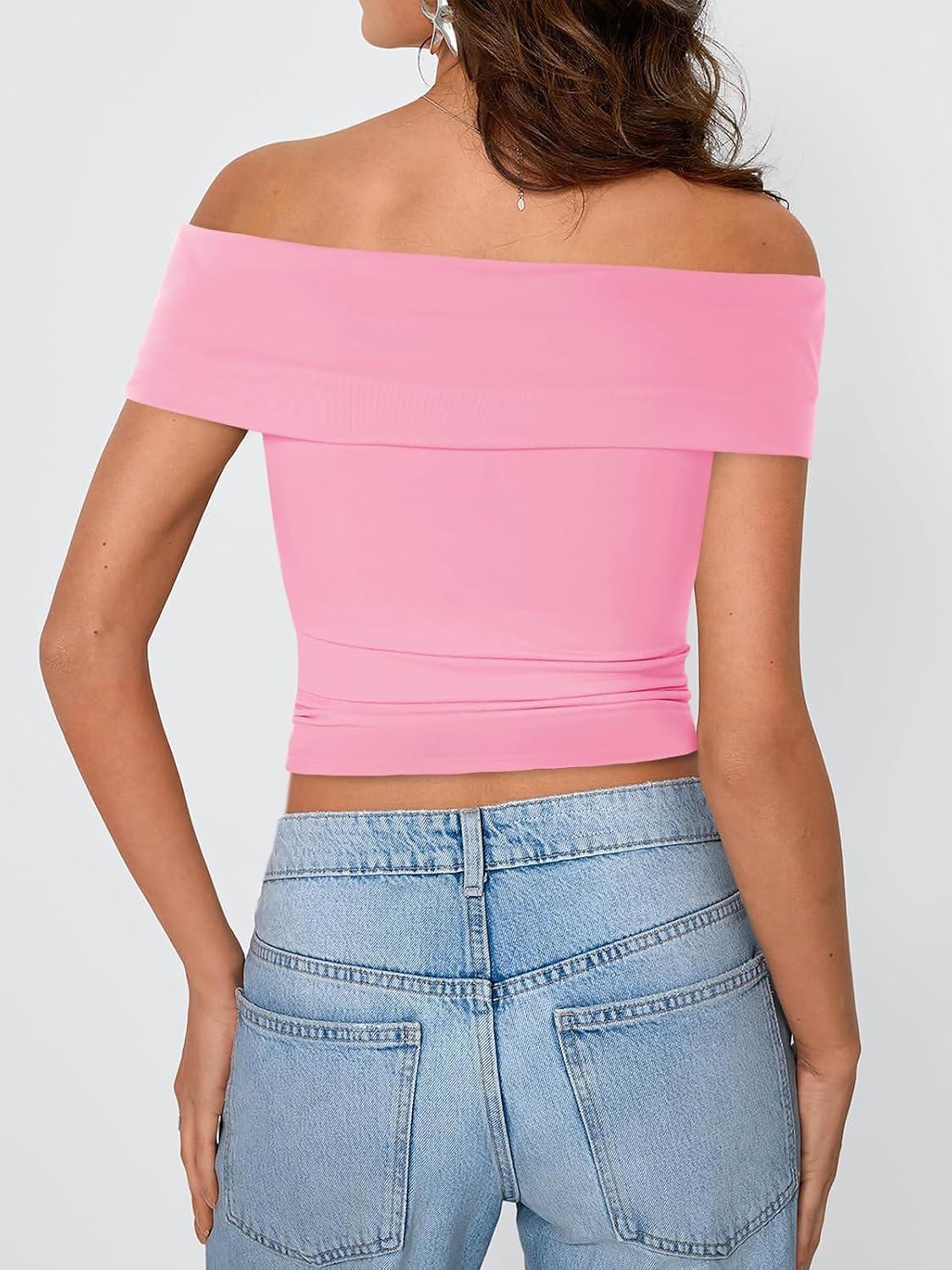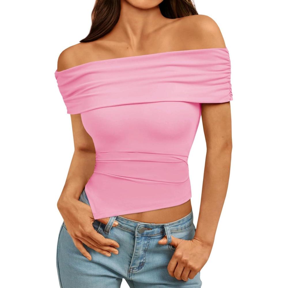 Imily Bela Women’s Summer Off The Shoulder Tops Casual Asymmetrical Slim Fit Y2K Going Out Cropped Shirts(Pink)