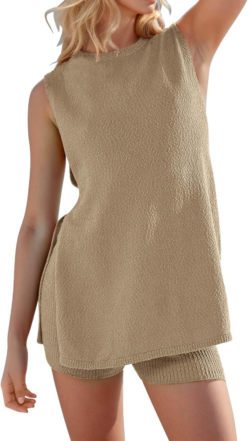 Imily Bela Womens Summer Sweater Sets Sleeveless Knit Tank Tops Matching Shorts 2 Piece Beach Vacation Outfits(Beige)