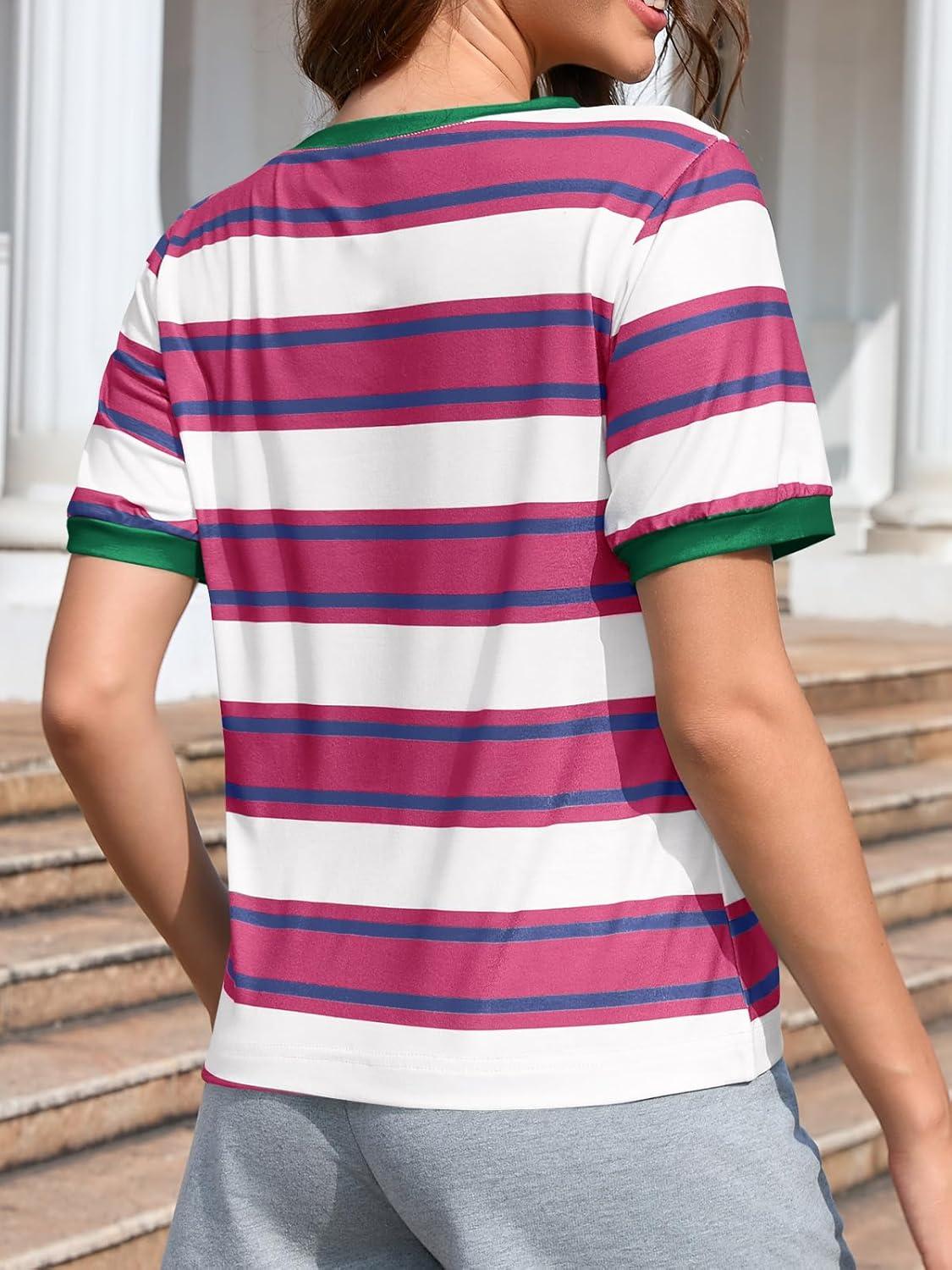 Imily Bela Womens Summer Tops 2026 Striped Color Block Short Puff Sleeve T Shirt Casual Crewneck Loose Basic Tee(Rose Red)