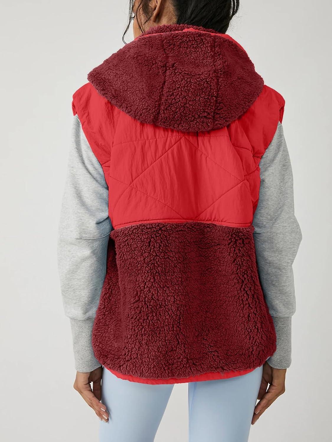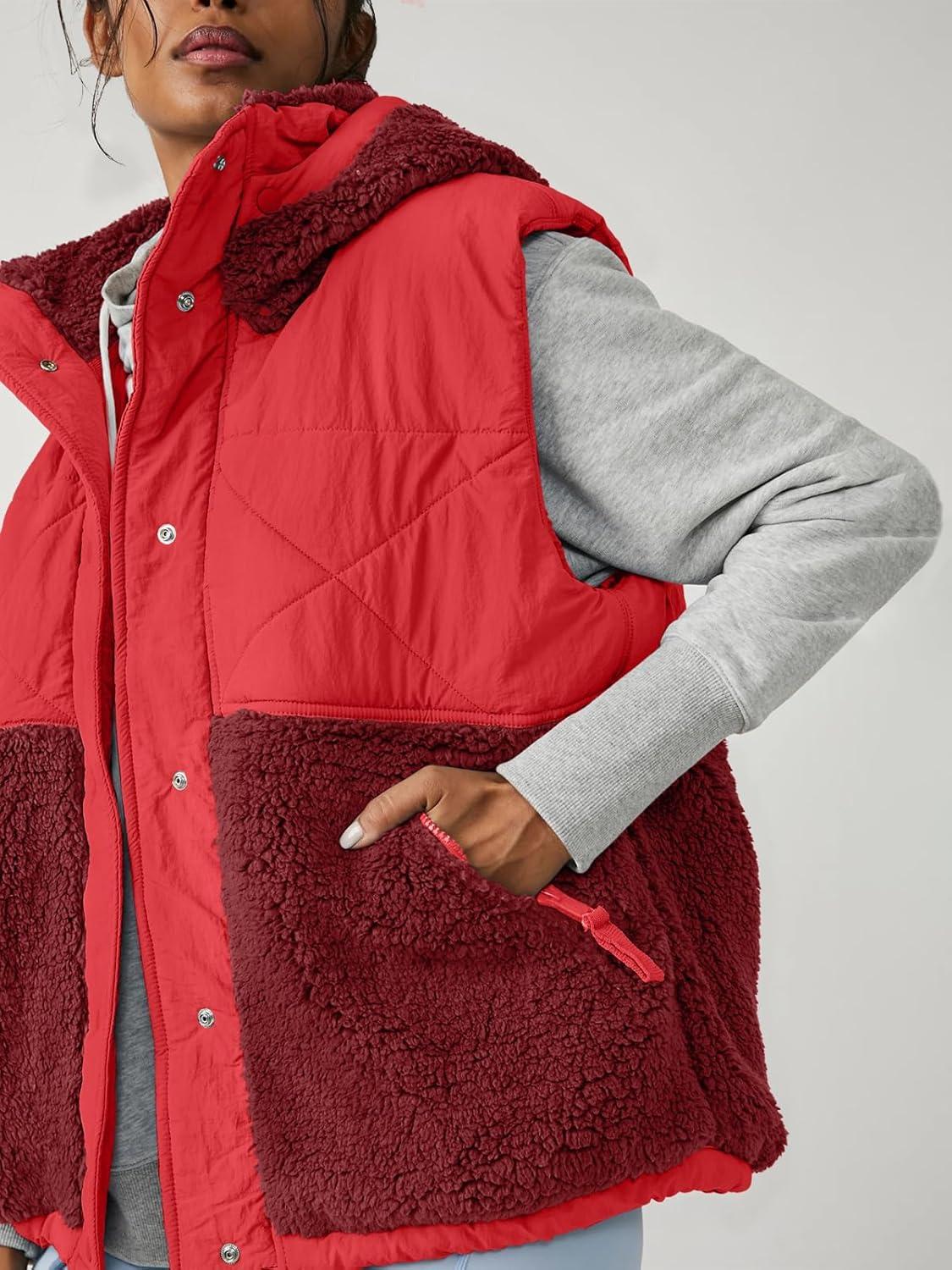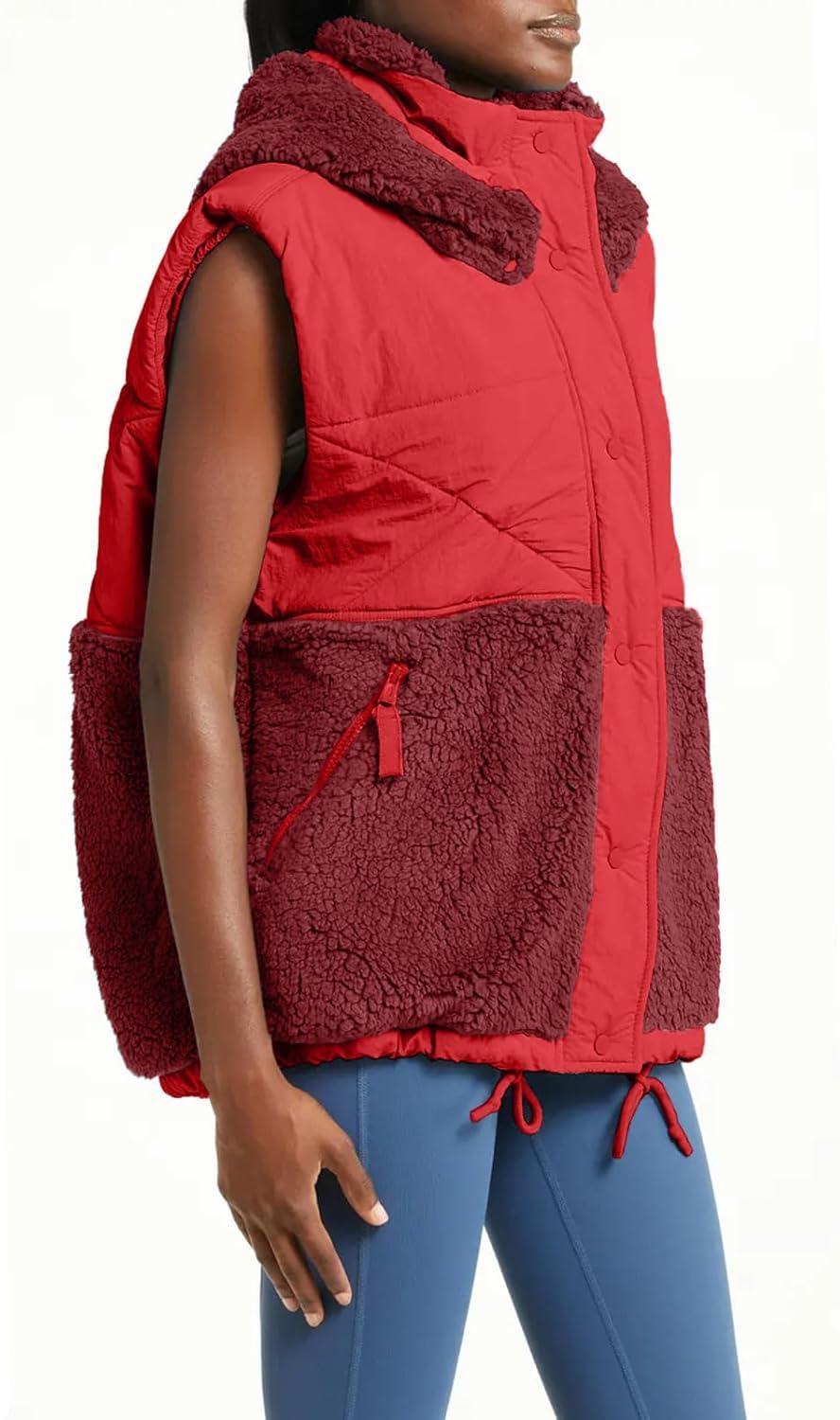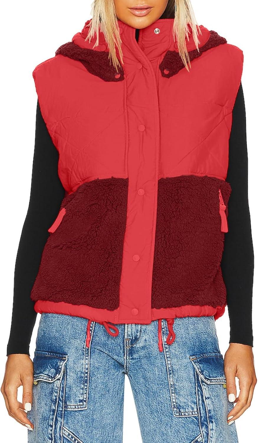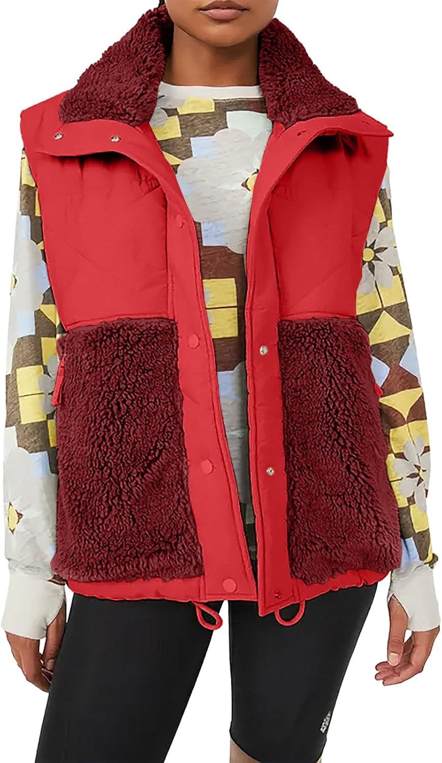 Imily Bela Womens Winter Sherpa Fleece Vest Stand Collar Button Down Sleeveless Jacket Casual Hooded Coat Outerwear(Red)
